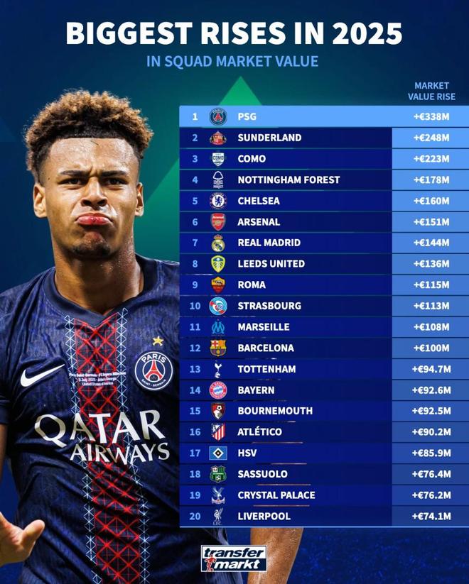 北京時間12月28日,德轉(zhuǎn)列出了2025年身價漲幅最高的20家俱樂部,巴黎圣日耳曼上漲3.38億歐元高居第一,切爾西、阿森納、皇家馬德里、巴塞羅那、拜仁慕尼黑以及利物浦也都榜上有名。